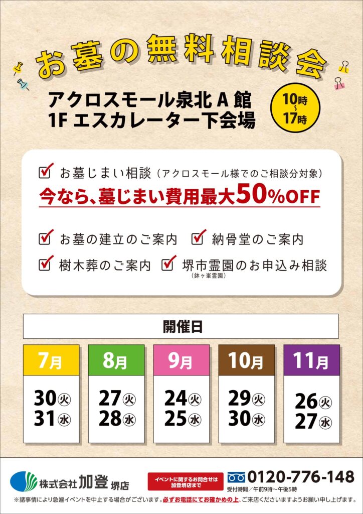またアクロスモール泉北にてご相談いただきましたお墓じまいは最大50%割引でご案内させていただきますので、是非この機会にお立ち寄り下さいませ。