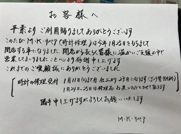 【閉店のお知らせ】MKリペア 日頃は当店をご利用いただきまして誠にありがとうございます。 誠に残念ではございますが、当店は、1月25日をもちまして閉店させていただくことになりました。 お客様には永きに渡り格別のご愛願を頂き、心より感謝申し上げます。