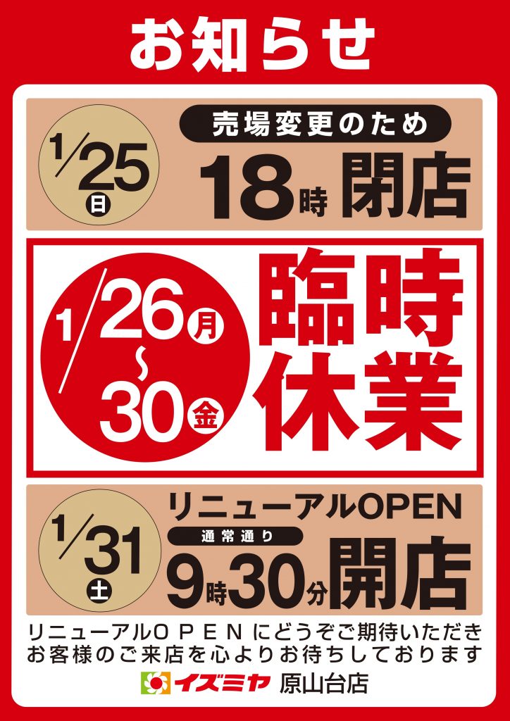 イズミヤ 原山台店臨時休業のお知らせ